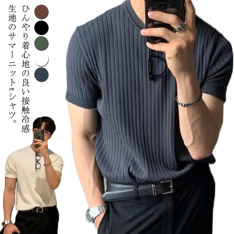 接触冷感 サマーニット tシャツ メンズ 涼しい 半袖ニット トップス アイスシルク 夏服 レイヤード 薄手 キレイめ