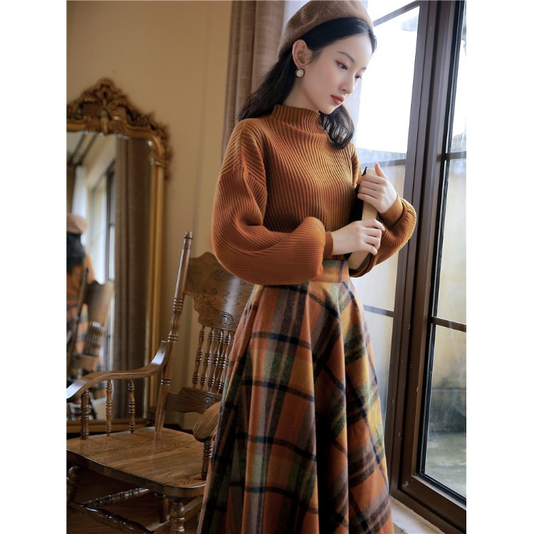 秋 冬 レトロワンピース レディースセットアップ レトロ レディース スカート セーター ニット 上下セット チェック柄 ミモレ丈 ロング 長袖 着痩せ きれいめ おしゃれ 大人かわいい 大正ロマン
