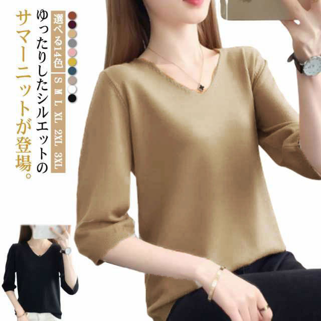 S~3XL サマーニット 薄手 着瘦せ 春夏 Tシャツ きれいめ S~3XLレディースファッション トップス Tシャツ カットソー