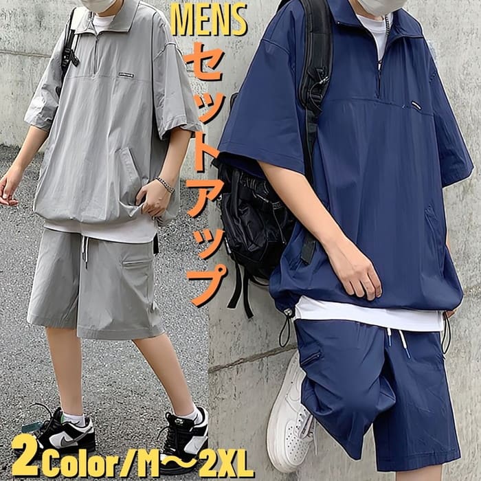 セットアップ メンズ 半袖 スーツ ハーフジップ カジュアルシャツ ハーフパンツ 2点セット サマースーツ 韓国 原宿 ストリート 通勤 高校生 中学生 通学 10代 20代 夏 ファッション オシャ